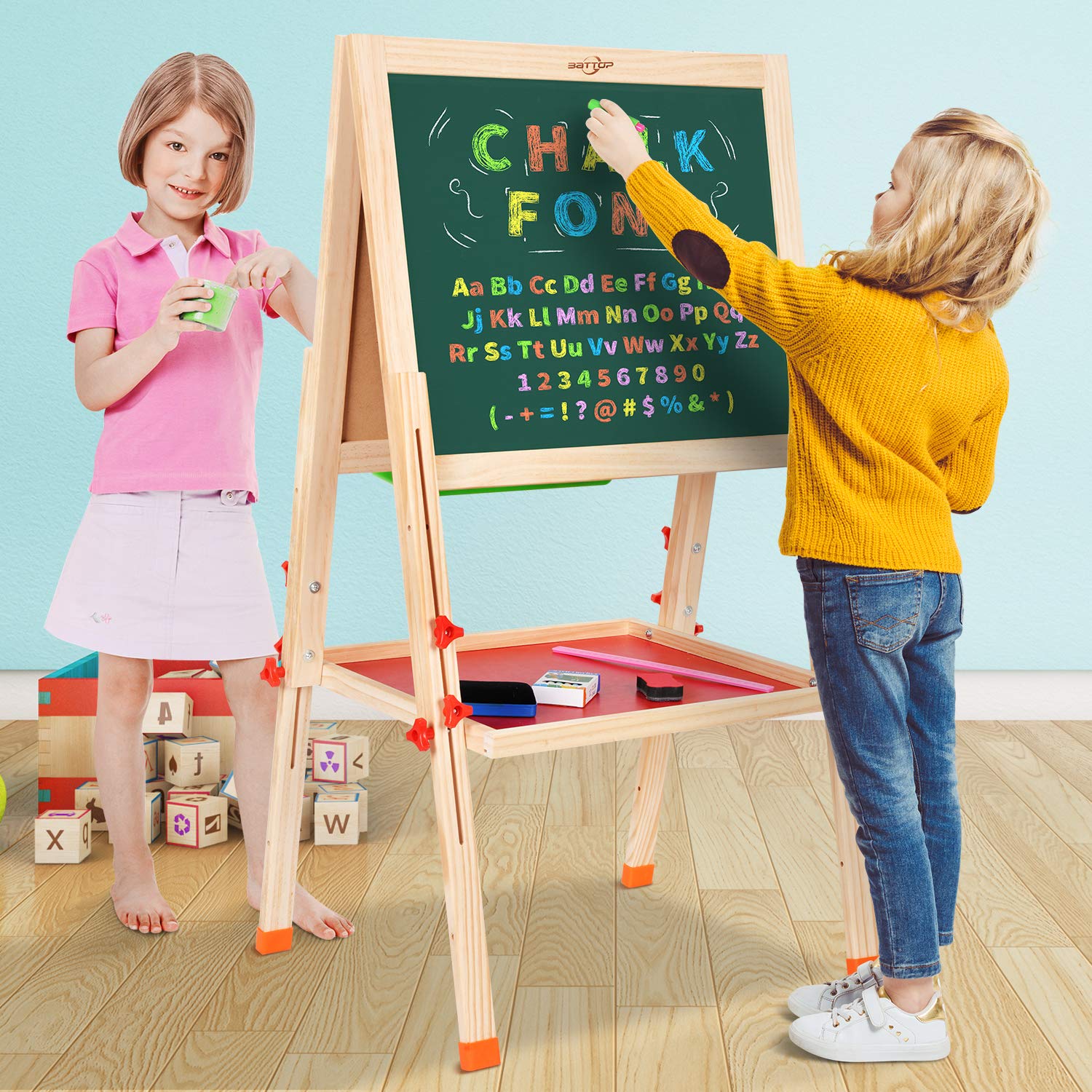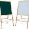 – Incluye: Un pack de tizas de 5 unidades,un marcador, un borrador y 7 tornillos de plástico, una pizarra, un soporte y 4 patas de madera.